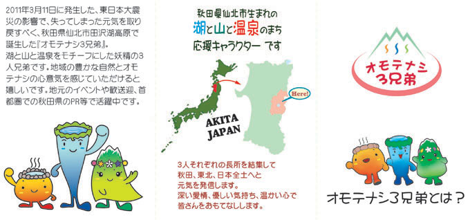 3人それぞれの長所を結集して田沢湖高原温泉郷から秋田、東北、日本全土へと元気を発信する『オモテナシ3兄弟』です。