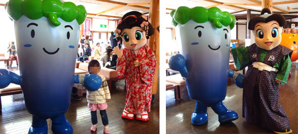 角館のマスコットキャラクターのお梅ちゃんと福松くん と一緒に