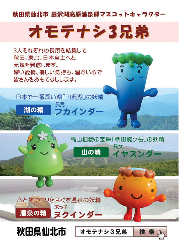 | これからも地域の活性化に努め、地元地域からの情報発信や観光PRのために、微力ながらも「オモテナシ3兄弟」の活動を継続し頑張っていく所存ですので、今後ともご当地キャラクター「オモテナシ3兄弟」へのご支援、ご指導をお願いいたしたく、ご案内申し上げます。 |